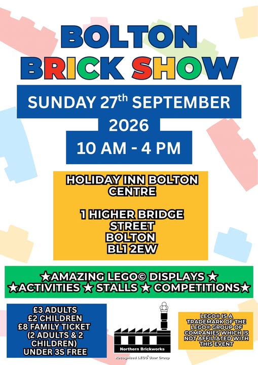 A brand new LEGO fan event for 2026 comes to Bolton. the Holiday Inn Bolton Centre will be filled with Amazing Lego displays, activities, trade stalls and competitions. This is a Northern Brickworks event.
